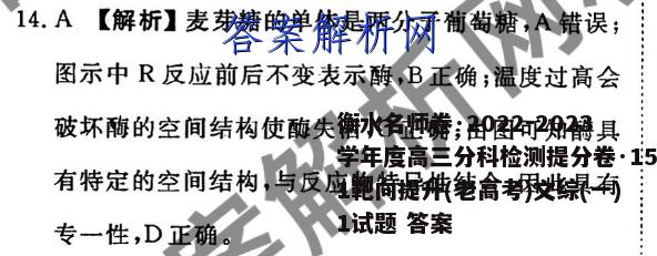 14.A【解析】麦芽糖的单体是两分子葡萄糖,A错误;图示中R反应前后不变表示酶,B正确;温度过高会破坏酶的空间结构使酶失活,C正确;由图可知酶具◆有特定的空间结构,与反应物特异性结合,因此具有专一性,D正确。