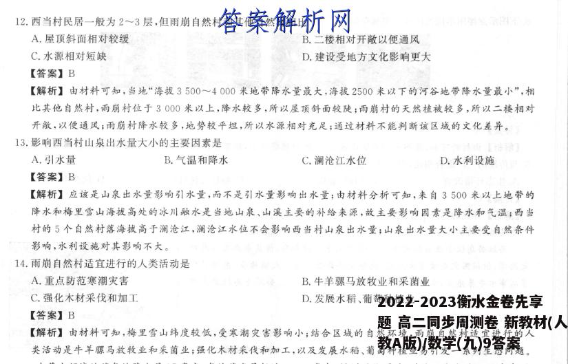 12.西当村民居一般为2一3层,但雨崩自然村和其他自然村相比A.屋顶斜面相对较缓B.二楼相对开散以便通风C.水源相对短缺D.建设受地方文化影响更大【答案】B【解析】由材料可知,当地“海拔3500一4000米地带降水量最大,海拔2500米以下的河谷地带降水量最小”,相比其他自然村,雨崩村位于3000米以上,降水较多,所以屋顶斜面较陡;雨崩村的天然植被较多,所以二楼相对开敞,以便通风:雨崩村降水较多,地势较平坦,所以水源相对充足;通过材料不能判断该区域的文化差异。13.影响西当村山泉出水量大小的主要因素是A.引水量B.气温和降水C.澜沧江水位D.水利设施【答案】B【解析】应该是山泉出水量影响引水量,而不是引水量影响出水量:由材料分析可知,来自3500米以上地带的降水和梅里雪山海拔高处的冰川融水是当地山泉、山溪主要的补给来源,故主要影响因素是降水和气温;西当村的5个自然村落海拔高于澜沧江,澜沧江水位不会影响西当村山泉出水量:山泉出水量大小主要受自然条件影响,水利设施对其影响不大。14.雨崩自然村适宜进行的人类活动是A.重点防范寒潮灾害B.牛羊骡马放牧业和采菌业C.强化木材采伐和加工D.发展水稻、葡萄种植业【答案】B【解析】由材料可知,梅里雪山纬度较低,受寒潮灾害影响小;结合区域的自然环境,雨崩自然村适宜进行的人类活动是牛羊骡马放牧业和采菌业;强化木材采伐和加工,以及发展水稻、葡萄种植业易引发一系列生态问题。