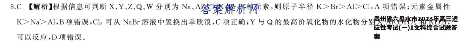 8.C【解析】根据信息可判断X、Y、Z、Q、W分别为Na、Al、Cl、K、Br五种元素,则原子半径K>Br>Al>Cl,A项错误;元素金属性K>Na>Al,B项错误;Cl2可从NaBr溶液中置换出单质溴,C项正确;Y与Q的最高价氧化物的水化物分别为Al(OH)3和KOH,可以反应,D项错误。