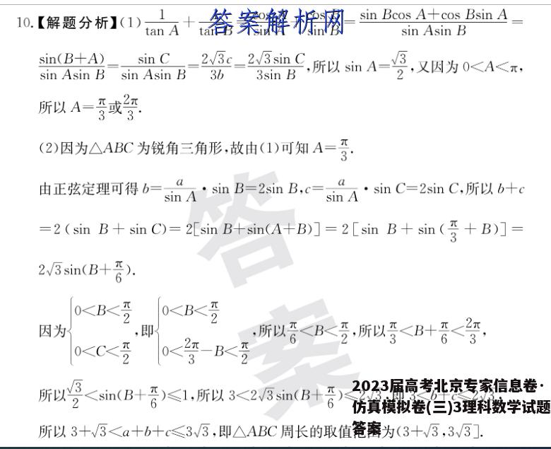 10.【解题分析】(1)cos Acos B sin Bcos A+cos Bsin Atan Atan Bsin Asin Bsin Asin Bsin(B-A)sin Csin Asin Bsin Asin B2-2,所以mA-号又因为0A<3所以A等或(2)因为△ABC为锐角三角形,故由(1)可知A=3,由正弦定理可得b=4sinA'snB=2snB.c=A·sinC=2sinC,所以+e=2(sin B+sin C)=2[sin B+sin(A+B)]=2[sin B+sin (B)]=2/3sin(B+).0